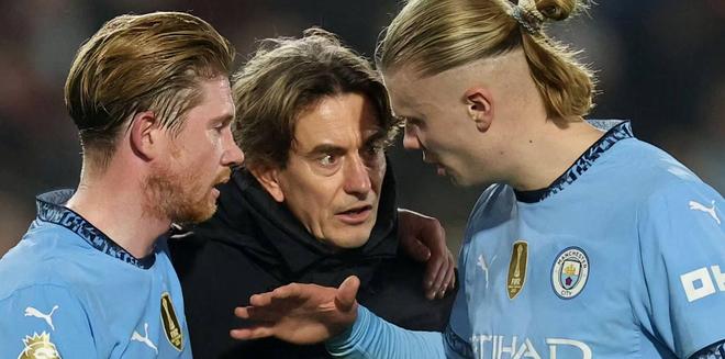 这里有一张照片:您站在现代足球界的两位巨星之间——哈兰德和德布劳内
