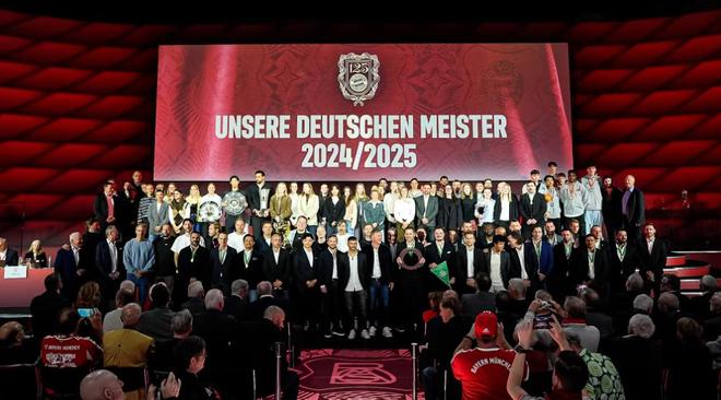 致辞结束后,海纳邀请所有在场的德国冠军队伍登上舞台合影。除男足、女足与男篮三支职业队伍外,还包括32岁以上元老足球队、40岁以上元老篮球队、U19男篮与U19乒乓球队。“你们就是拜仁慕尼黑——你们都是冠军。” 海纳说道。
