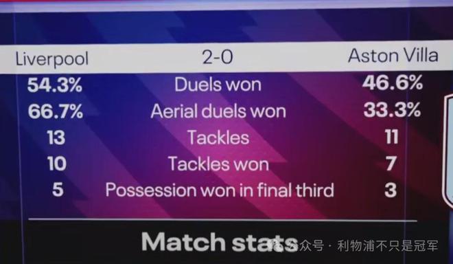 最终体现在数据上,利物浦本场争顶和对抗成功率都压过对手,特别是争顶成功率高达66.7%,确保了利物浦的空域安全。