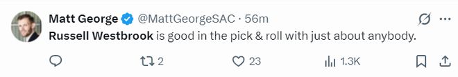 国王记者:拉塞尔-威斯布鲁克可以跟任何人挡拆,挡拆配合时他都非常出色。